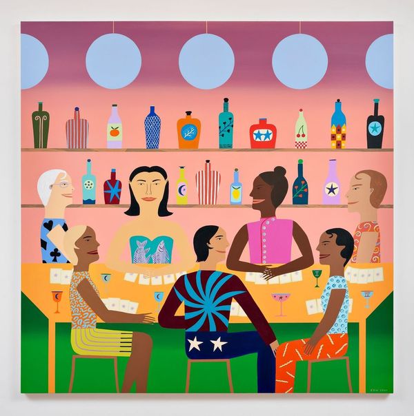 Seven people sit at a table and each of them have five cards facing down. The bottles on the bar shelves behind them have a beautiful mixture of fruit and other graphic iconography on their labels. Globe lights hang from the ceiling. The goblets they are drinking out of have either moons or stars or roman numerals on them and their insides are lacquered with different colors. One woman wears a tube top with two fishes pointing in opposite directions which you can imagine are made out of sparkles.