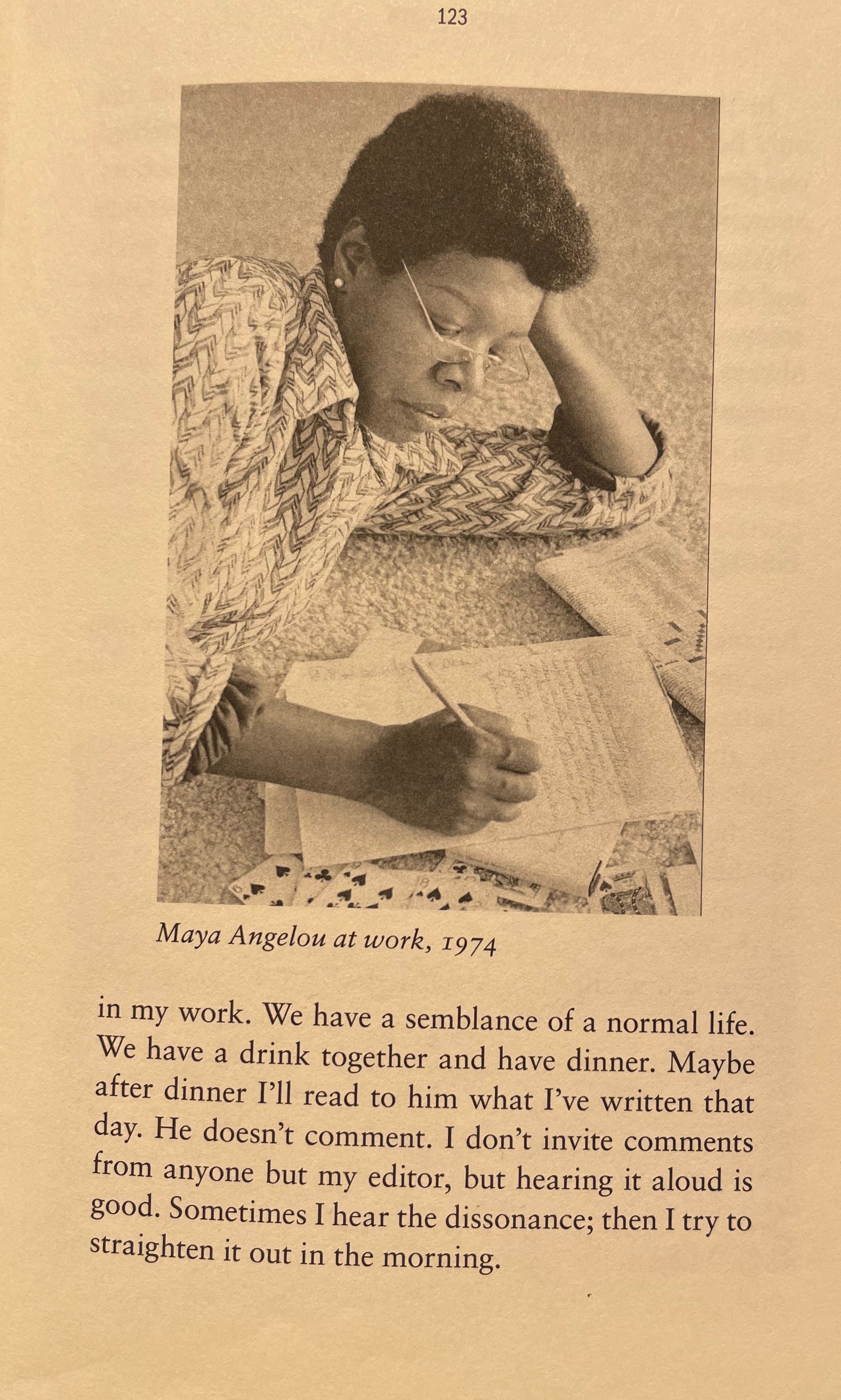 Across the aisle I open a book about artist rituals and Maya Angelou, who’s practice is one of my favorites: in short, to write in an unadorned room that is not her own and then go home to make dinner. Strange it should strike me as so ideal, since I DO NOT COOK DINNER.