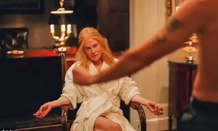 As we all know, the actress known as Nicole Kidman plays a high-powered woman who has an affair with a younger male intern. Their sex is based on him dominating her, specifically him getting her to follow his instructions. He goes between being a newbie at this dynamic, stumbling when he asks her to get on her knees, to being borderline cruel in his delivery. Nonetheless, this is foreplay for this couple who have what seems like vanilla sex otherwise and just basically seem hot and heavy for each other. Unfortunately for Romy, Nicole Kidman’s character, she is married, has children, and is the CEO of the company where they both work. So he, as he calls out, has nothing to lose and she everything—which is why he is the one who holds all of the power.