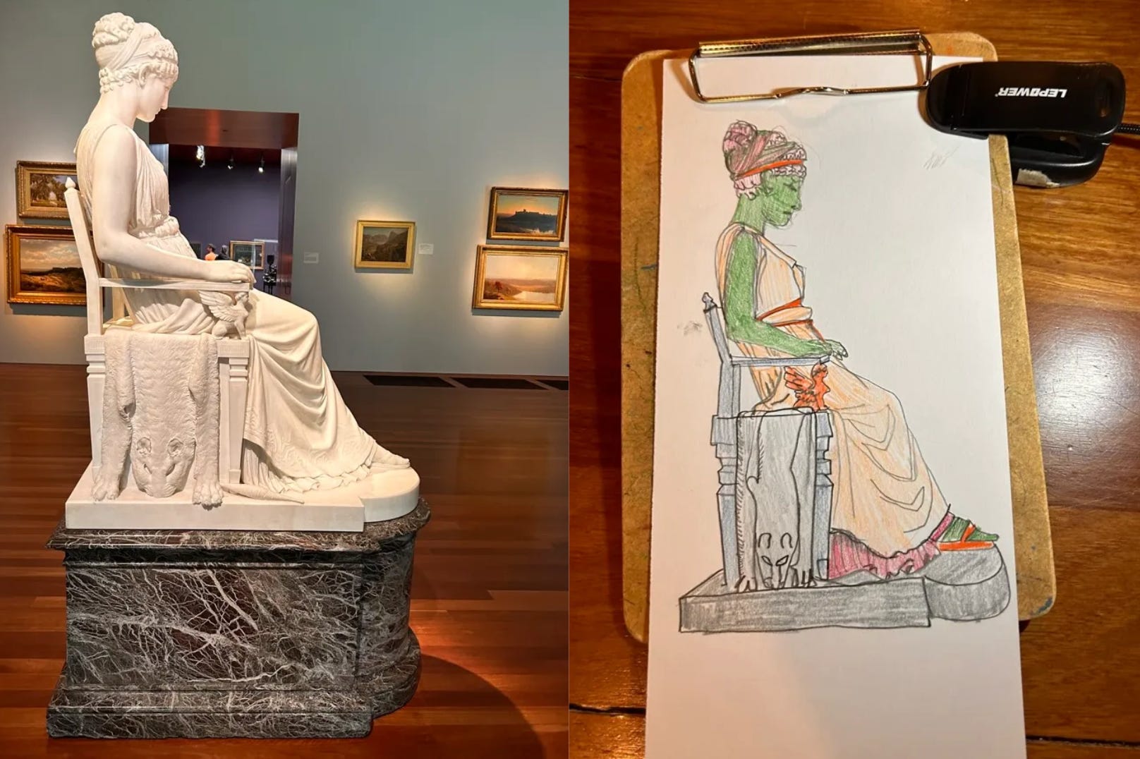 The drawing program, I came to understand, is more a set of resources and a suggestion: this time to find representational images of the seasons to draw. I ignored the prompt and took a collection of colored pencils and a squishy eraser from a rolling cart over to a sculpture I saw earlier in the morning. I set up my little black folding seat at her side and put my thin vertical paper on a clipboard and planned out the hour before going down to get a ticket for the talk. I would outline the figure in pencil and then have some fun putting color onto the image, since the sculpture was all white marble.